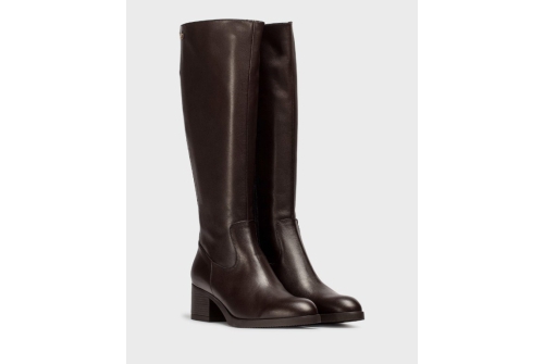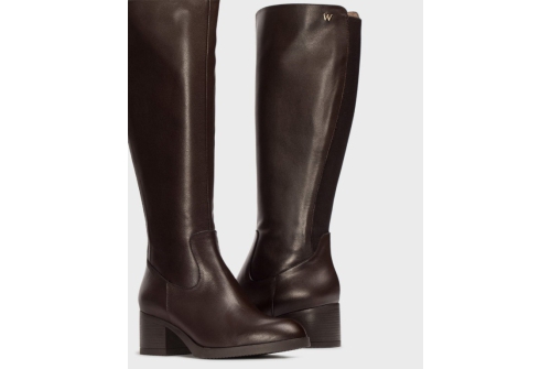 SANTAFE 50 boots made from a mix of brown textile and leather. A classic riding-boot silhouette enhanced by a metallic “W” detail on the outer side. The wide back elastic and side zip work together to ensure a perfect and secure fit.