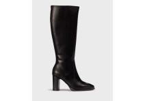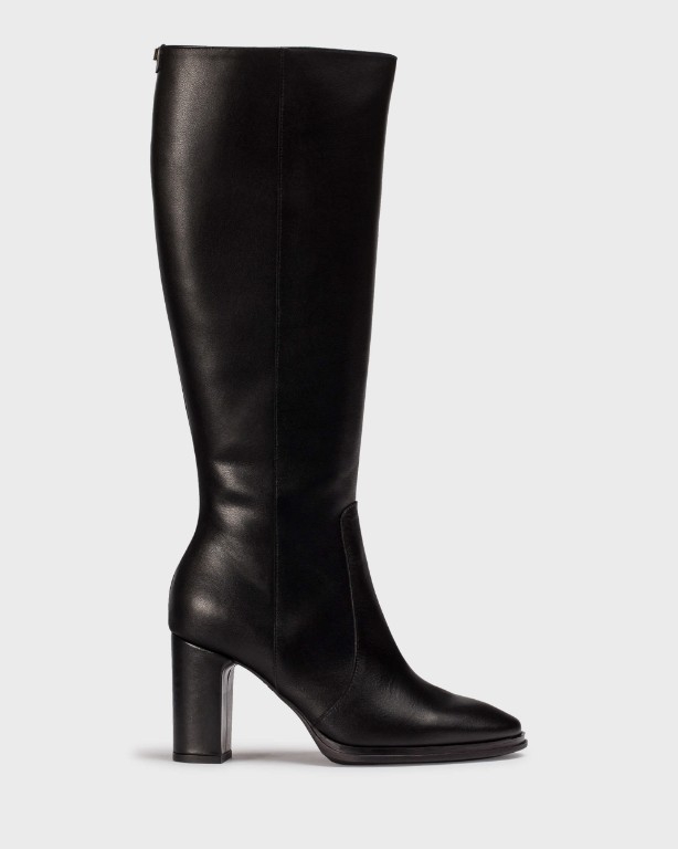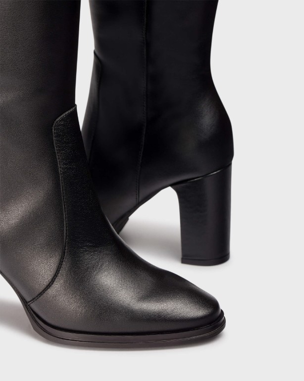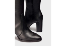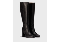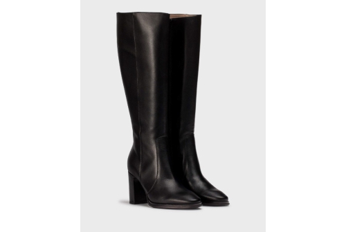 TREZE 50 boots crafted in smooth black leather. This refined and versatile design features a streamlined silhouette and slightly pointed toe for a sophisticated, elongating effect. The tall boot has no unnecessary seams, offering a sleek and elegant look. The interior zipper ensures an easy and secure fit. With a stable block heel and a flexible rubber sole, each step is supported with comfort, enhanced by the MemoryGel insole for added cushioning.