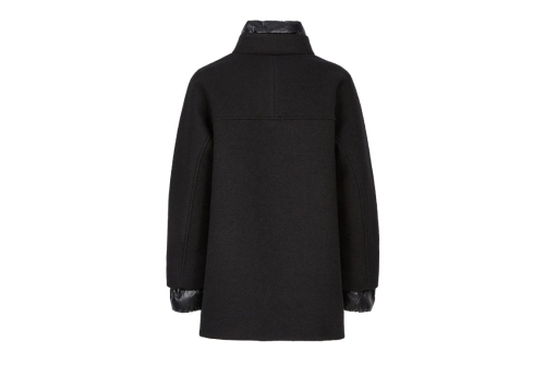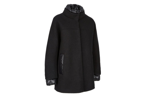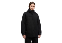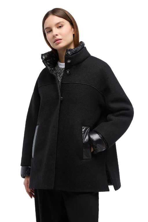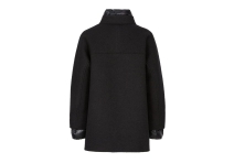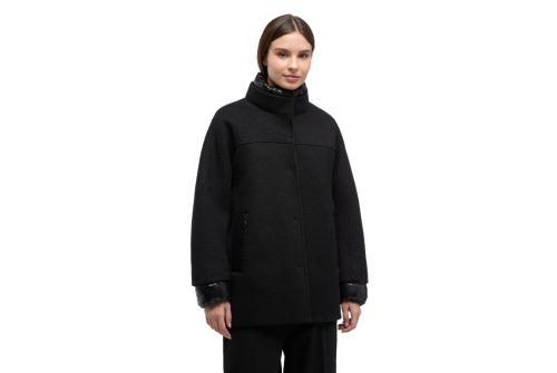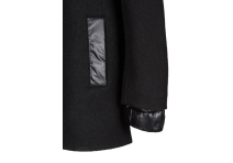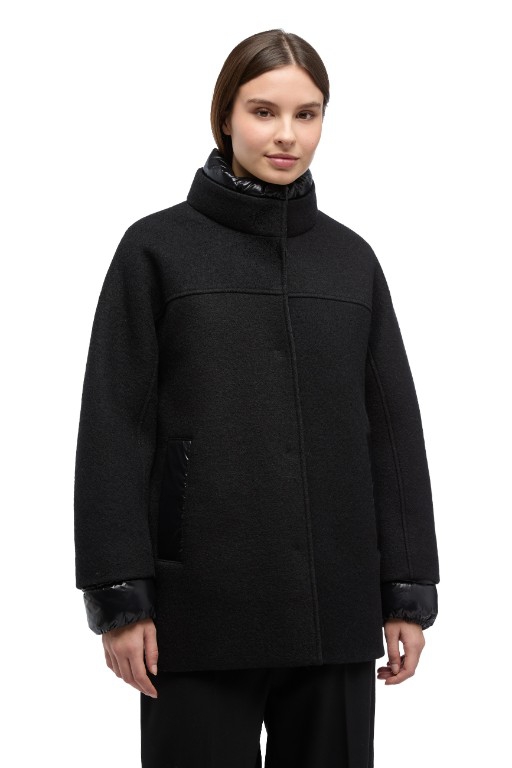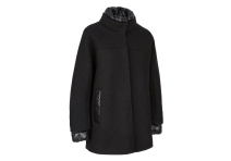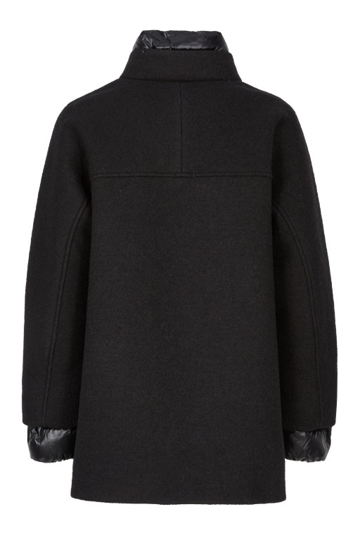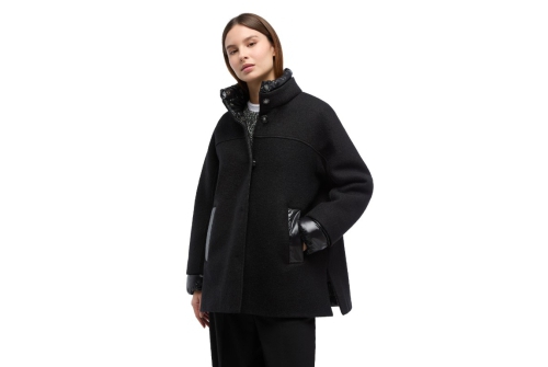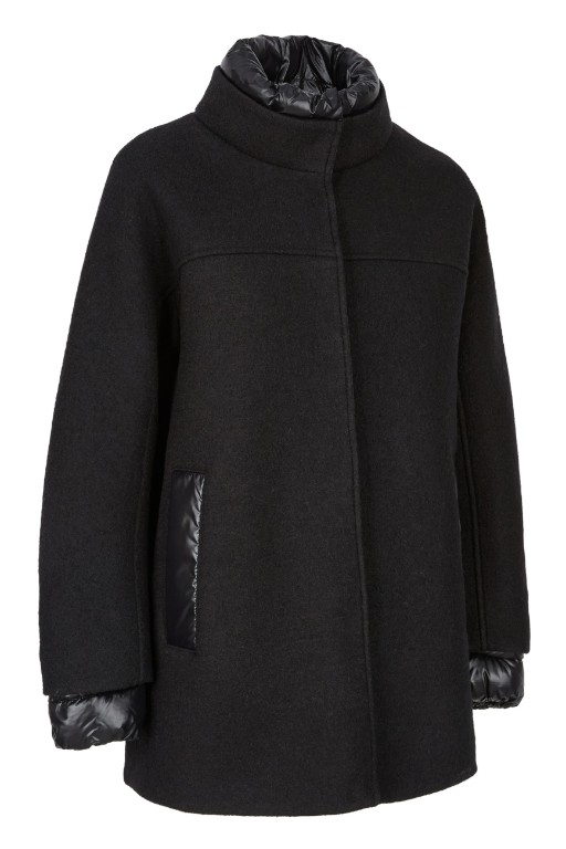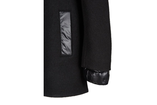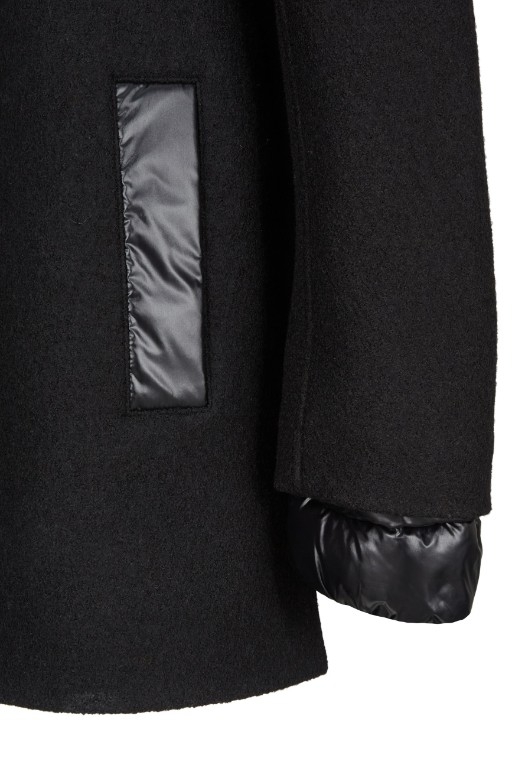 Longline contemporary-looking parka jacket for women with a practical hidden popper fastening . This version has been crafted from boiled wool in black with a wind-blocking finish, shiny nylon detailing and recycled lining and padding. Kleopy guarantees optimal breathability and comfort on those city days, and will prove to be the perfect way to round off urban looks in colder weather.