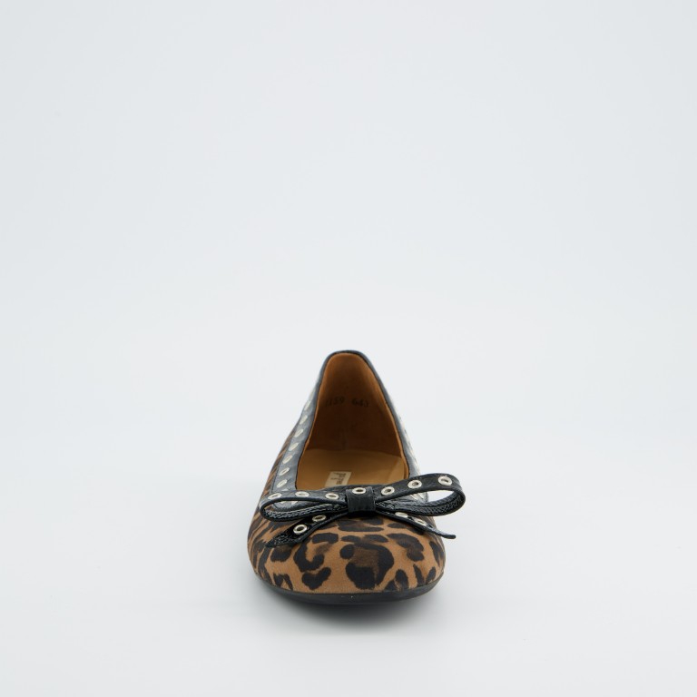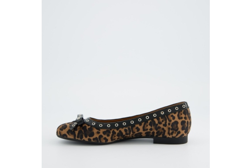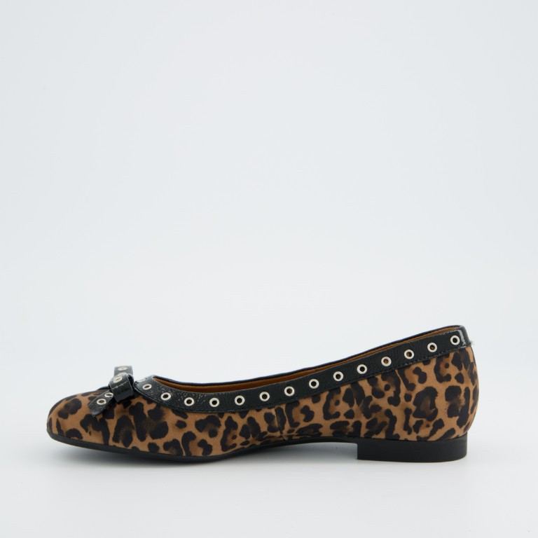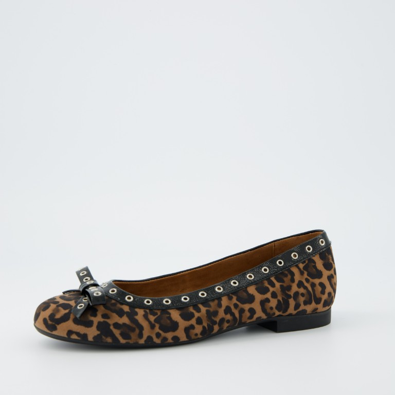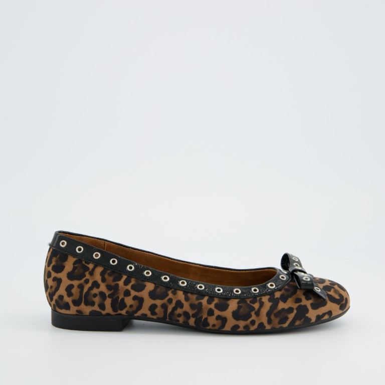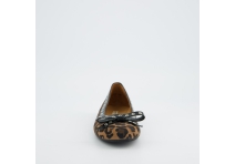 Leopard print suede in black and brown, trimmed in black patent leather with silver keyhole ..and matched with a delicate bow...