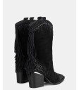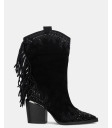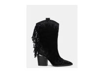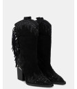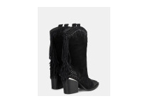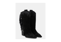 The statement mid-high boot is characterised by the cowboy silhouette. Crafted in supple suede, it is finished with rinestones delicately decorating the black suede, tassle detail at the back and a oblique block heel defined by a faceted, triangular cut.