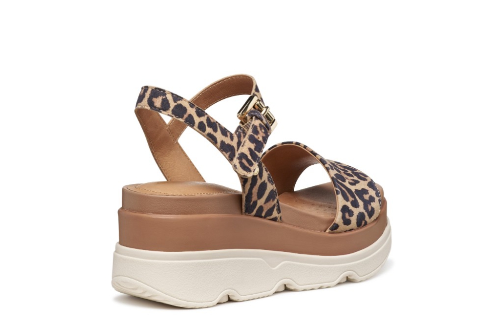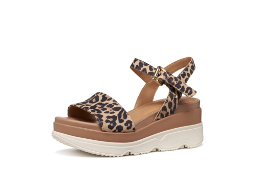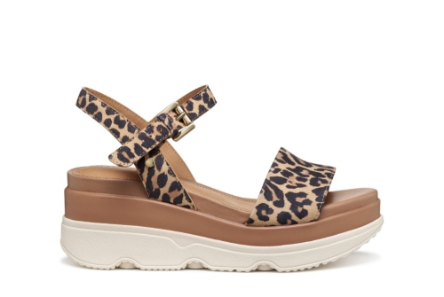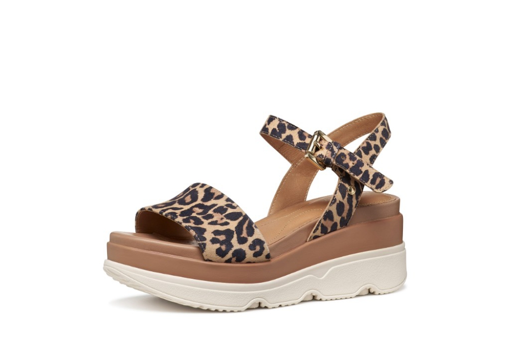 Lightweight and stylish platform sandal from GEOX with an ankle strap in a versatile animal print and beige colour combination. Made from soft suede, a comfortable, on trend addition to Summer wardrobe. 5.5 cms