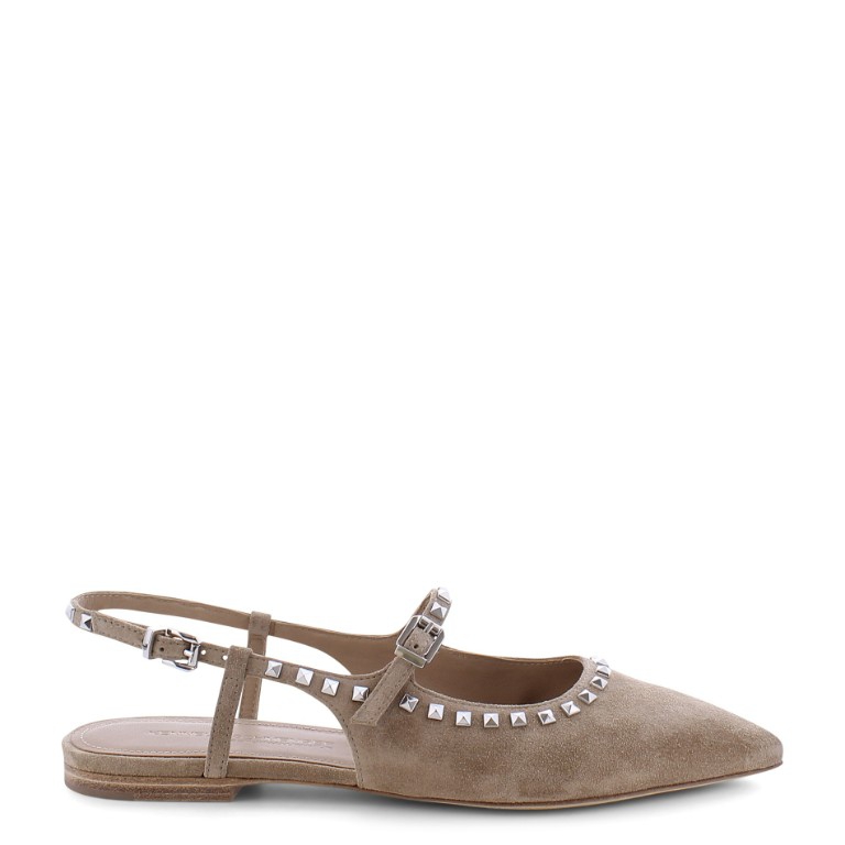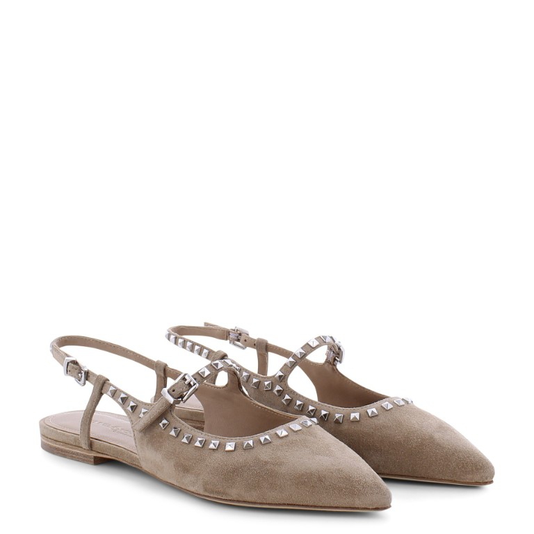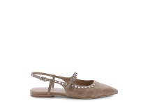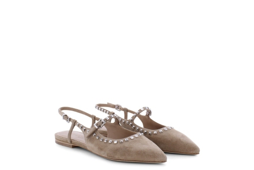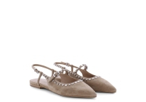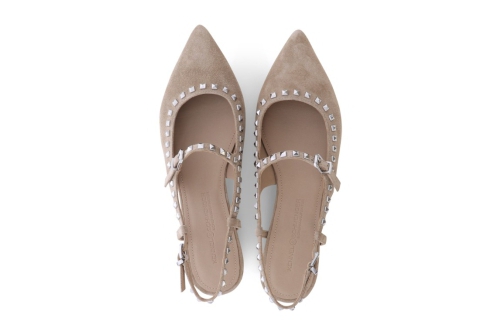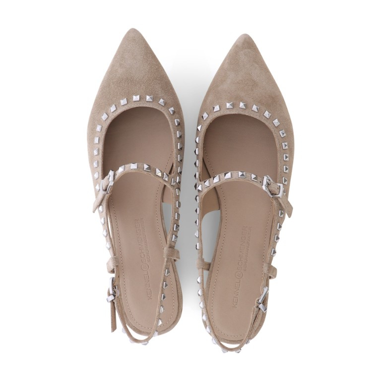 On trend slingback ballet pump designed and crafted in high quality soft suede leather by Kennel and Schmenger, it is a versatile light beige colour and has a strap across the instep featuring silver stud detail. A light and modern addition to your Summer wardrobe, comfortable and styllish for a relaxed city look.
