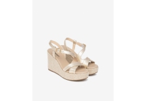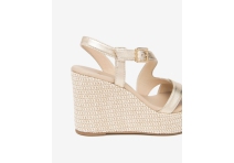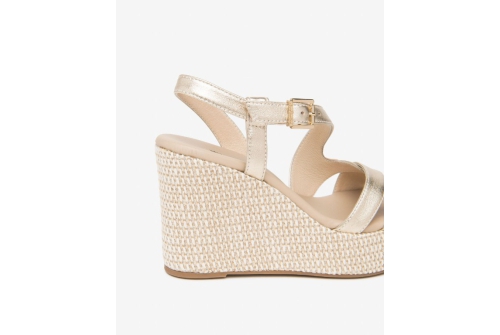 The Malfa espadrille wedge is made in Italy from Italian leather and sits on a lightweight gold woven espadrille wedge.