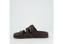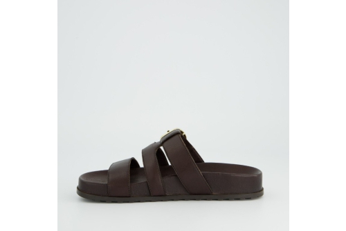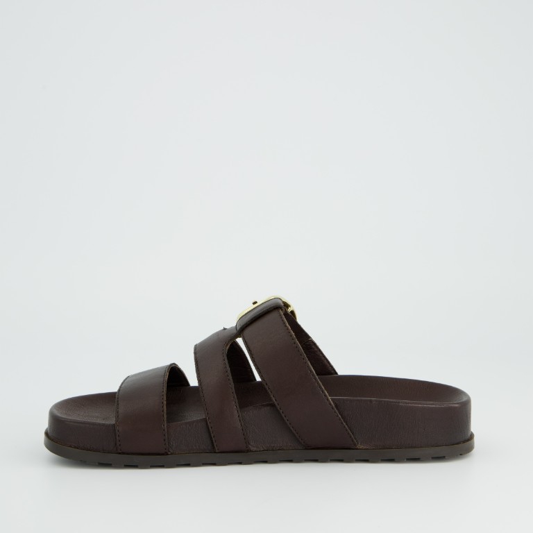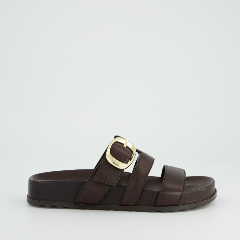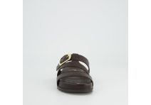 Brown soft leather, adjustable fastening across foot, with gold buckle.