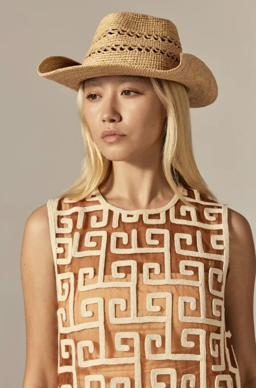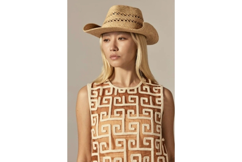 The Gwen Fedora is defined by its Daelis stitch raffia crochet and flexible wire brim, which gives the option to wear flat or to shape with a touch of cowboy-inspired flair.